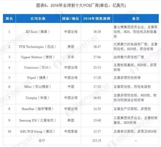 全球印刷電路板行業(yè)集中度不高,生產(chǎn)商眾多,市場競爭充分。雖然目前PCB行業(yè)存在向優(yōu)勢企業(yè)集中的發(fā)展趨勢,但在未來較長時期內(nèi)仍將保持較為分散的行業(yè)競爭格局。根據(jù)N.T.Information發(fā)布的2018年世界百強PCB企業(yè)排行榜,2018年前十大PCB廠商收入合計為211.51億美元。2018年全球前十大PCB廠商的銷售情況如下: